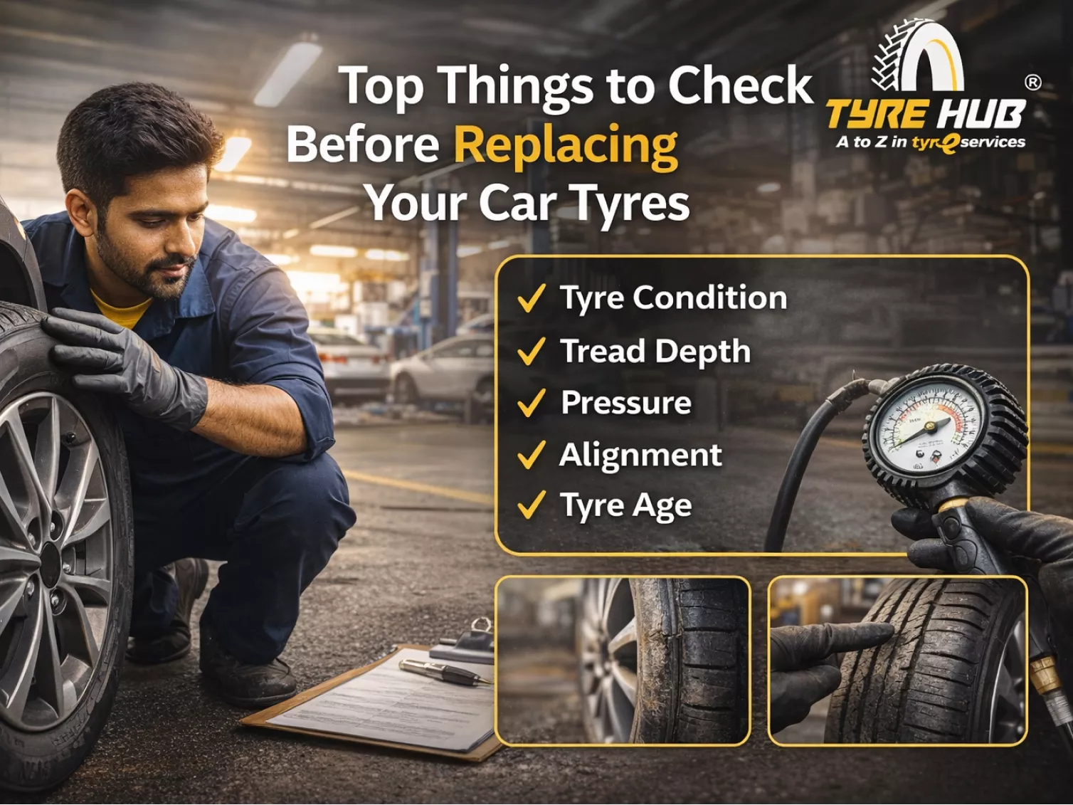 Check tread depth, tyre pressure, visible damage, tyre age, and wheel alignment to ensure they are in good condition before proceeding.